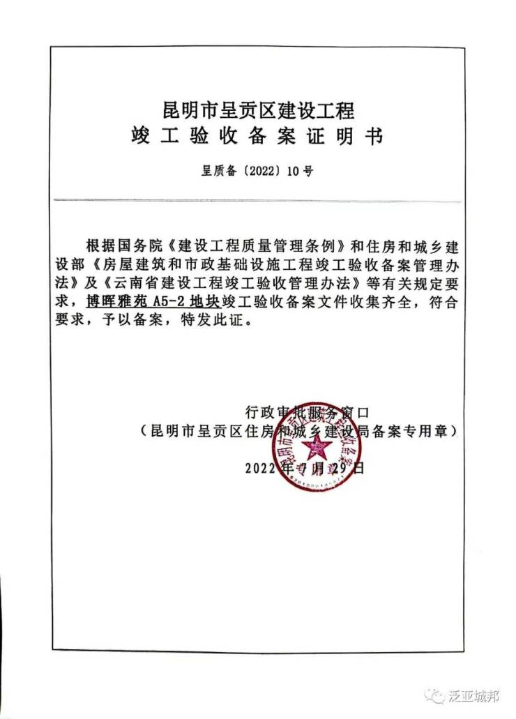 据悉泛亚城邦官方公众号公示,博晖雅苑A5-2地块于2022年7月29日正式通过竣工验收。项目已开始办理交房手续。