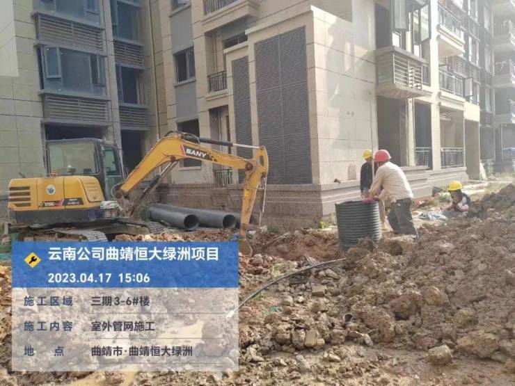 3-6栋室外管网开挖施工,室外雨污管网安装施工完成30%,新增完成约30%;永水工程3-6栋地下室供水主管施工完成30%,新增完成约30%;消防工程3-5栋地上部分的风阀材料到场开始安装施工,地下室通风系统风管安装完成60%,新增完成10%;3-6栋消防电系统穿线施工完成20%,新增完成20%。