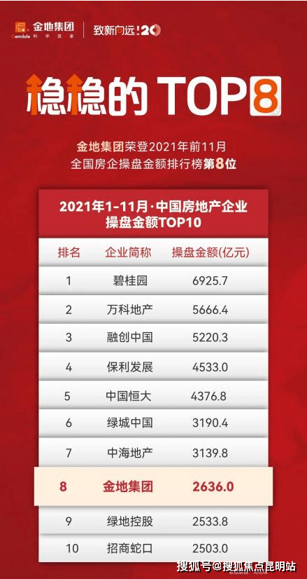 纵观全国地产品牌的排序,自三道红线颁布后,十字路口,有人跌落,有人进取,有人企稳,招保万金的四字招牌正在重回峰顶,地产排序完成了一轮新的大洗牌,2021年1~11的全国房企操盘金额金地集团以2636亿元位列第8。