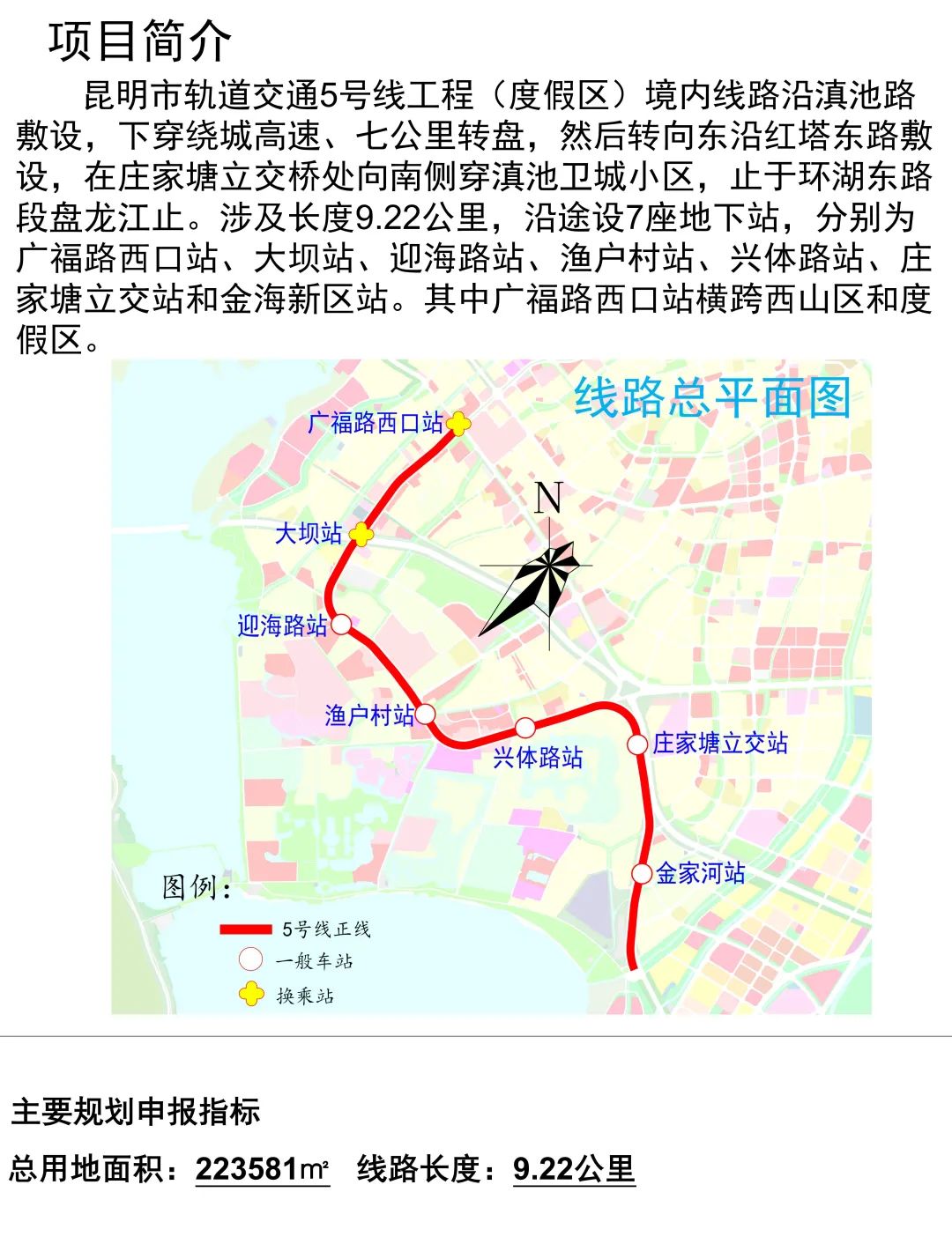 项目名称:昆明市轨道交通5号线工程(度假段) 项目性质:城市轨道交通 申报类别:建设工程规划许可证 申报单位:昆明轨道交通集团有限公司 公示时间:2022年3月8日至2022年3月16日 公示地点:昆明城市规划展览馆、项目现场、昆明市自然资源和规划局官网、“昆明自然资源和规划”新浪微博、“昆明空间规