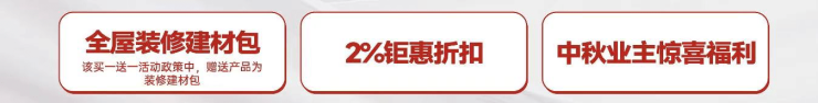 目前,项目有金秋国庆双节狂欢提前享福利:买房就送全屋装修建材包,线上2%购房优惠券已开抢,中秋业主专享惊喜大礼!
