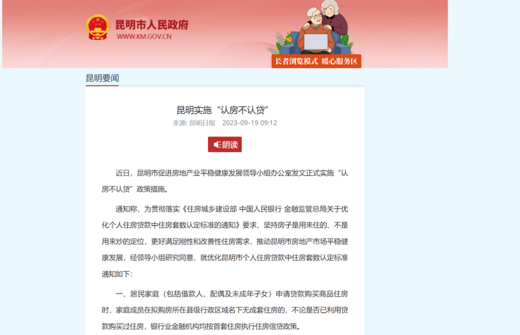 9月18日,昆明市促进房地产业平稳健康发展领导小组办公室发文,正式实施“认房不认贷”政策措施。