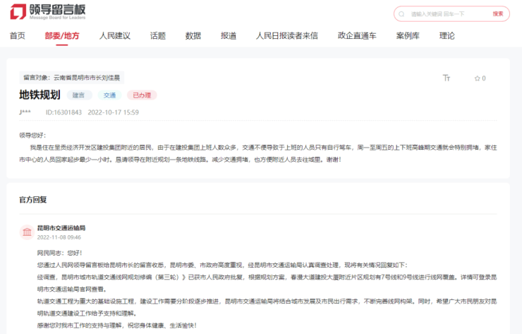对于网友在人民网“地方领导留言板”反映“希望在春漫大道建投大厦附近规划一条地铁线路”的留言,昆明市交通运输局于11月8日进行了回复。