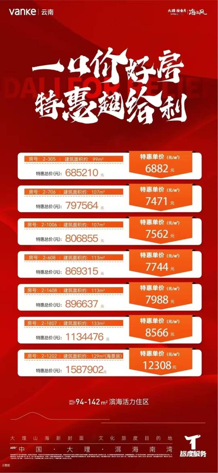 万科·大理·拾叁月,建面约94-142㎡滨海活力住区,一口价好房特惠超给利!关注万科·大理·拾叁月的朋友可前往售楼处现场看房,咨询房源信息请拨打电话4001560036 转 415736!