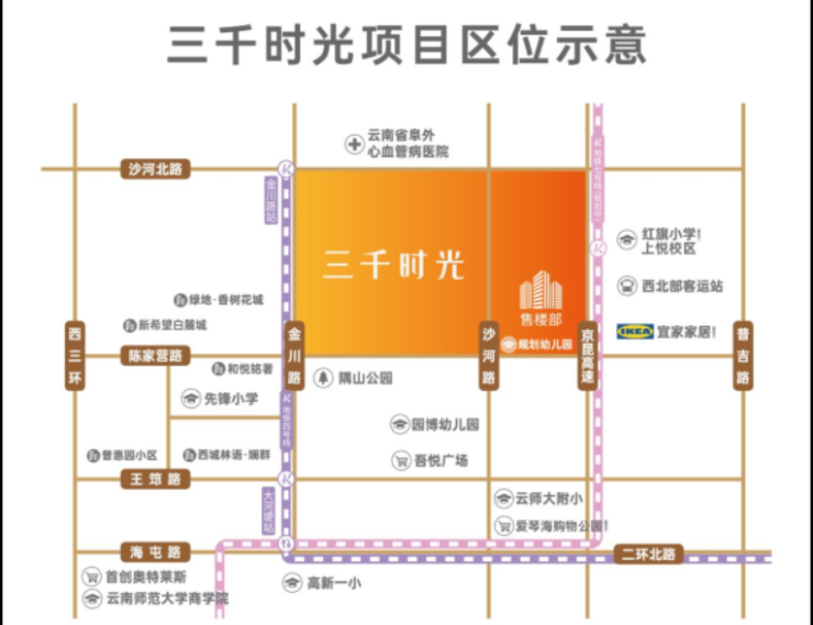 三千时光周边汇集宜家云南首店(仅约700米距离,数据来源:百度地图)、吾悦广场(仅约500米距离:数据来源:百度地图)、首创奥特莱斯等多元化的商业配套。“家门口”就可享受一站式繁华生活。
