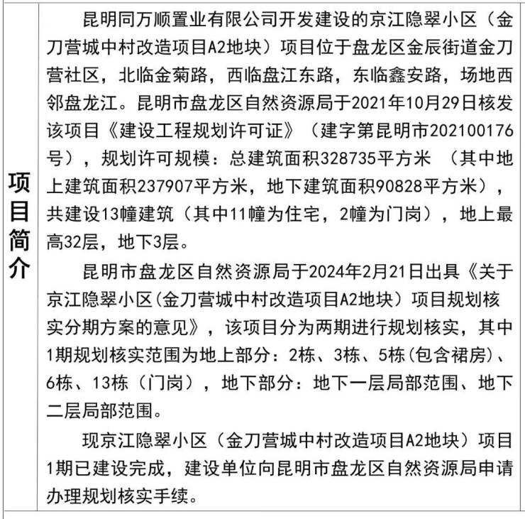 京江隐翠小区(金刀营城中村改造项目A2地块)项目1期用地性质为二类居住用地,由昆明同万顺置业有限公司申报,公示时间为2024年6月11日-2024年6月19日。该项目位于昆明市自然资源和规划局官网、“昆明自然资源和规划”新浪微博、“昆...