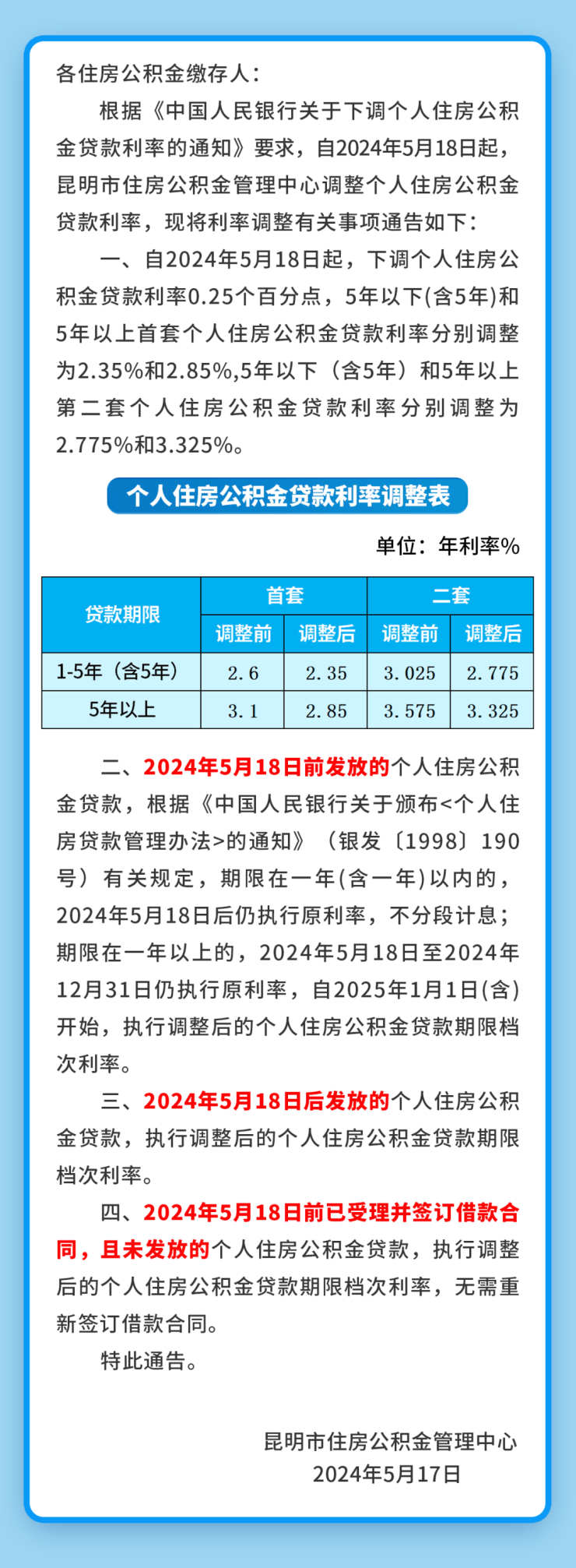 昆明市住房公积金管理中心关于调整个人住房公积金贷款利率的通告