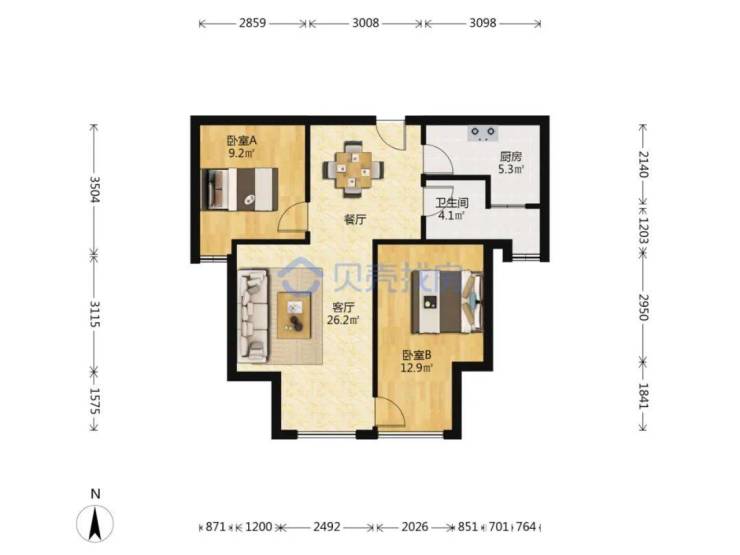 建面约67㎡户型为两室两厅一卫,南/北/东南朝向,虽然是小户型,但是整体比较方正,空间利用合理。L型厨房连接生活阳台,但厨房与卫生间都需要通过生活阳台二次采光,整体的通风效果弱了一些。
