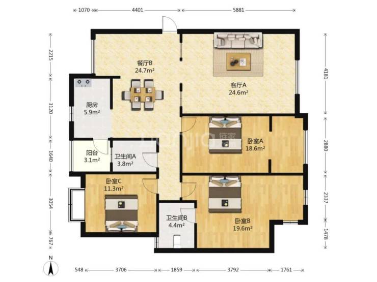 建面约137㎡户型为三室两厅两卫,各个朝向均有,整体格局方正,还可改造为四室。这个户型从挂出的房源来看,需要关注一下朝向,朝向好的房源整体也较为明亮,朝向不佳的房源则比较看运气,不同空间的明暗区别非常明显,这一点甚至还反应在了房价上。