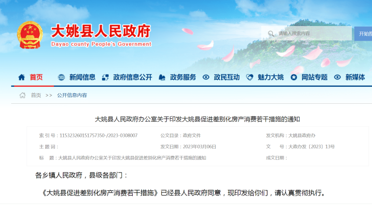 3月6日,楚雄州大姚县人民政府官网发布《大姚县人民政府办公室关于印发大姚县促进差别化房产消费若干措施的通知》(下称“《通知》”),《通知》包含了“鼓励农民进城购房”、“鼓励改善性住房需求”、“鼓励发展康养医养旅游类地产”等十条措施。