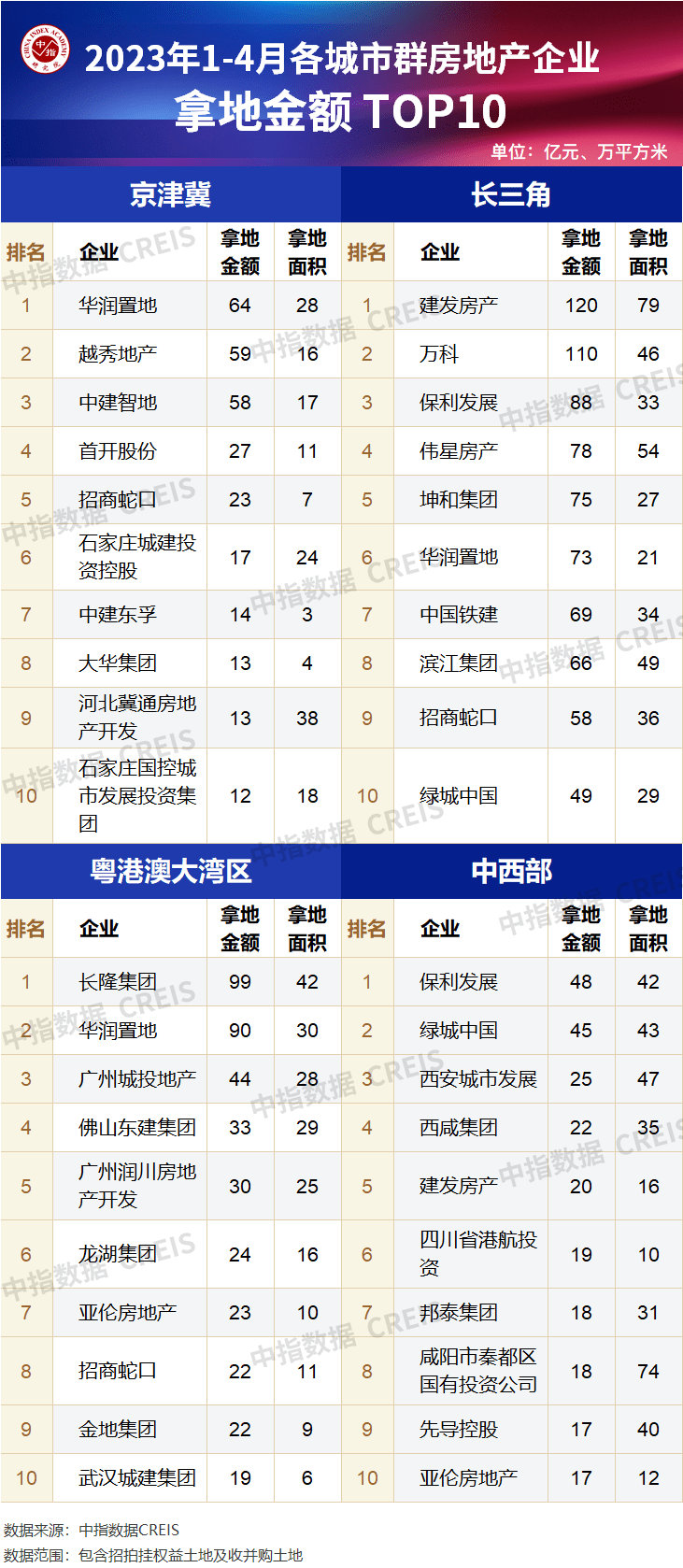 与此同时,区域和不同城市群对企业拿地的吸引力也在进一步分化。从金额来看,长三角地区领跑全国,1-4月,长三角TOP10企业拿地金额786亿元,居四大城市群之首;粤港澳TOP10企业拿地金额406亿元,位列第二;京津冀TOP10企业拿地金额299亿元,位列第三。