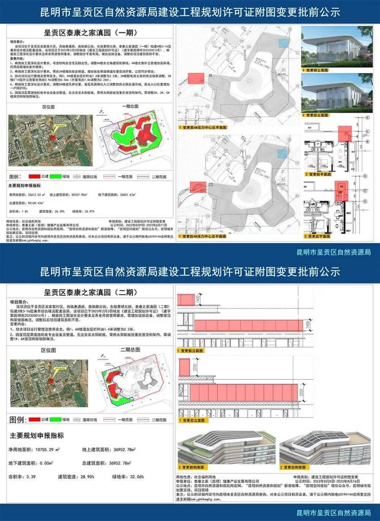 8月8日、9日,昆明市自然资源和规划局分别发布了呈贡区泰康之家滇园(一期)、(二期)建设工程规划许可证附图变更批前公示。