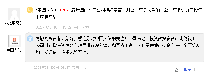 8月9日,中国人保针对“国内房地产公司持续暴雷,是否会对公司资产产生影响?”等问题做出回复,中国人保表示,公司房地产投资占投资资产比例较低,对新增房地产项目进行深入调研和严格审查,对存量房地产类资产进行全面检测和定期评估,投资风险可控。