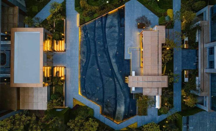 其中,南中庭以阔面水景和品质会客空间为主,光影交错,搭配乌桕、香樟等名贵绿植,颇有艺术之美。