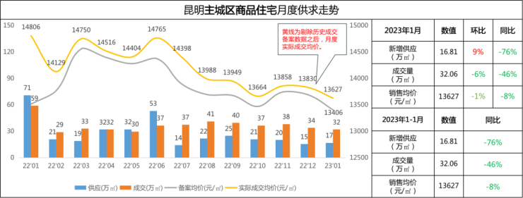 据昆明房协统计,1月昆明主城新增住宅供应16.81万方,环比增加9%,同比减少76%;成交32.06万方,环比减少6%、同比下降46%。(数据说明:时间维度为12月26日-1月25日)
