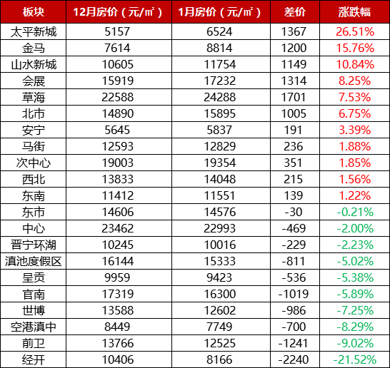 降幅最大的是经开区,环比下跌14.8%,主要是受片区内产品结构性调整,12月备案的项目到1月基本就没有了,导致了价格波动,属于正常现象。