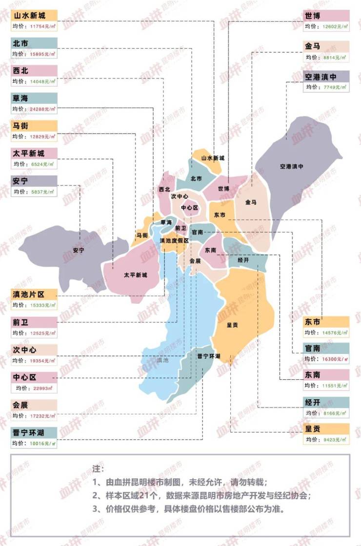 首先来看看昆明1月房价地图,此次采集区域依然为21个,南至晋宁环湖片区,西至安宁片区,东至空港滇中片区,北至山水新城片区。(注:房价数据为昆明房协提供的备案价格,与开发商售楼部报价有出入为正常现象)