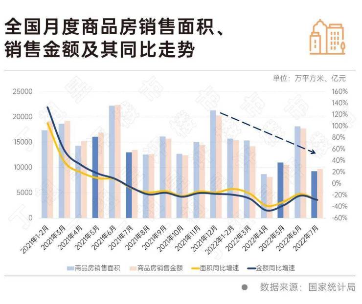 国家统计局数据显示,7月,商品房销售规模在年中高速增长后回落。7月,全国商品房分别销售9255万平方米和9691亿元,环比下降均超过四成,较5月分别下降16%和8%;同比则分别下降29%和28%,较6月降幅分别扩大了10个百分点和7个百分点。