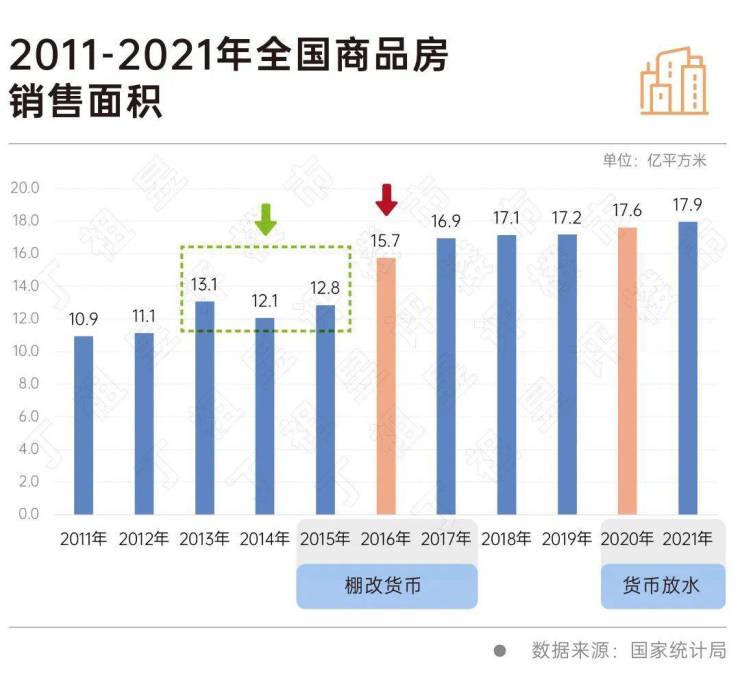 首先,2015年至2017年,受惠于棚改货币化安置加速推进,全国商品房销售面积在短短两年内由12.8亿平方米提升至16.9亿平方米,净增加4.1亿平方米。