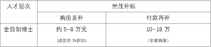 以符合政府补贴政策的全日制博士,购买世茂·璀璨世家产品,并选择全款购房,可同时享受政府补贴约8万元(实际申领规则和方式以政府公示文件为准)、世茂购房直接补贴5~8万元、全款再补贴10~18万元,总计约23~30万元超额补贴: