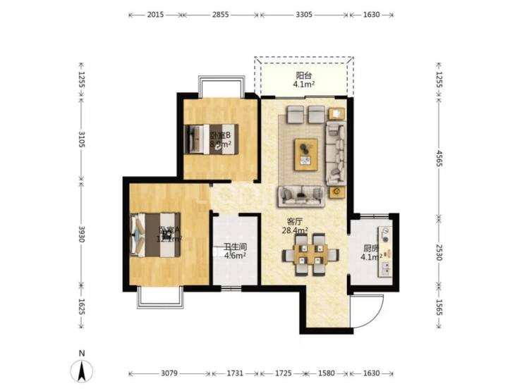 建面约83㎡的户型两室两厅一卫,户型算不上方正,但明厨明卫,每个房间都有飘窗充分保证通风采光。