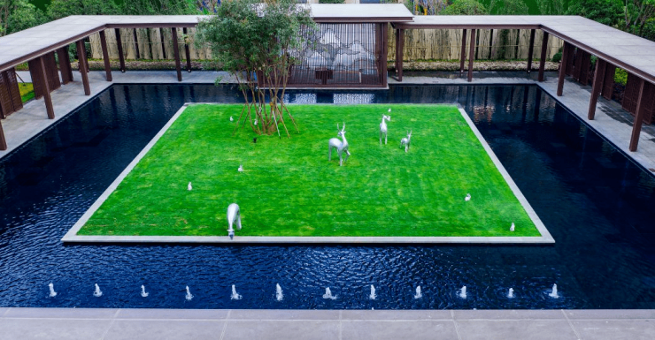 东区还设置有水景,同时做了大面积草坪,总体看上去很是大气,但水景维护就比较难,稍微懈怠两天池子就会泛绿,看上去会有些脏兮兮。