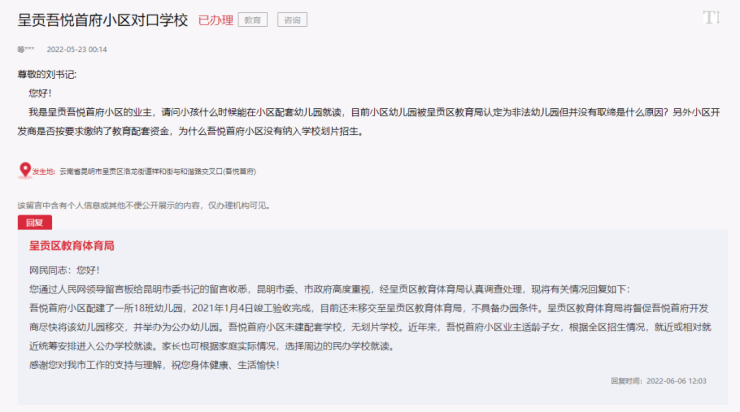 此外,小区没有划片学校,此前曾统筹就读呈贡区洛龙学校(官方回复中建议家长可根据家庭实际情况,选择周边的民办学校就读),如果有教育资源方面的需求,那建议再考虑考虑。
