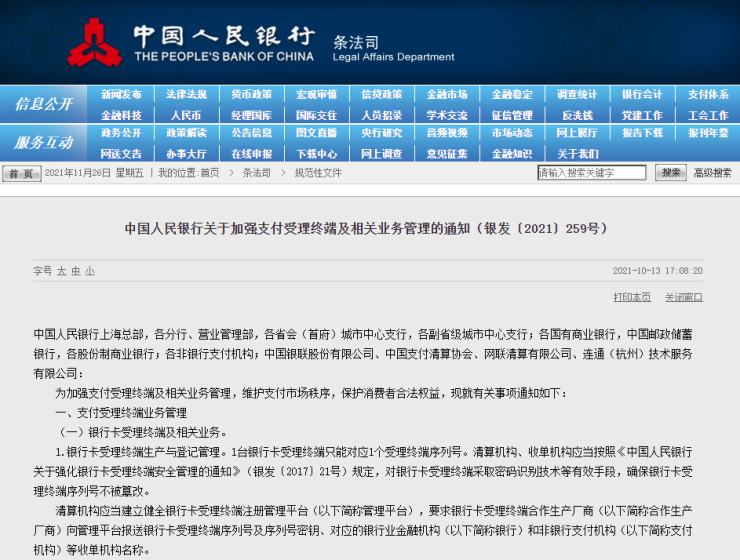 在消费者的日常生活中,扫码支付等支付方式已不鲜见,这样的行为将被纳入监管。2021年10月13日,央行官网发布《中国人民银行关于加强支付受理终端及相关业务管理的通知(银发〔2021〕259号)》,从支付受理终端业务管理、特约商户管理、收单业务监测三个方面入手,对收单机构和清算结构提出了一系列的管理要求。与此同时,条码支付也被纳入监管,对个人收款条码的使用规范做出具体规定,并将于2022年3月1日起施行。