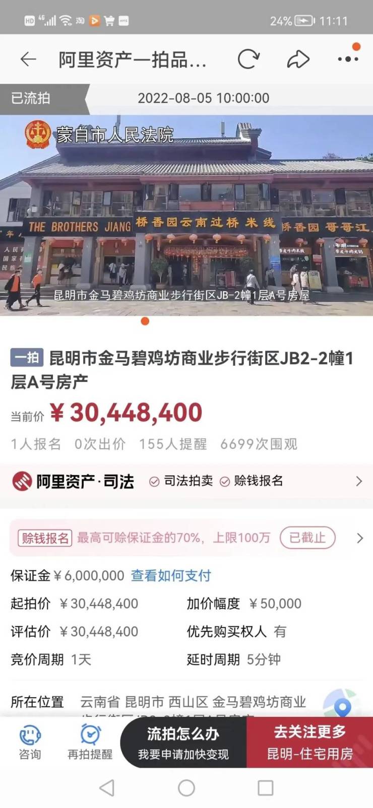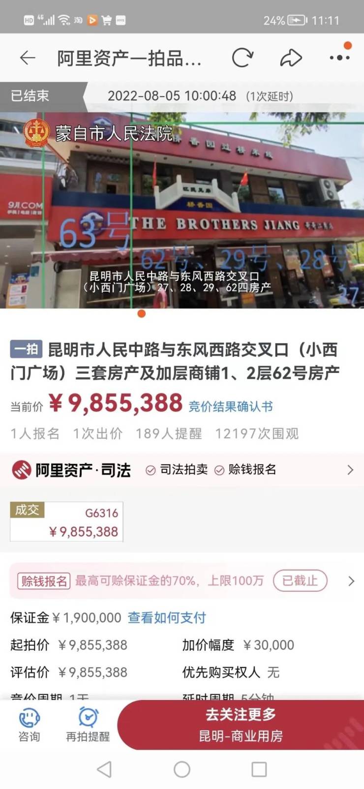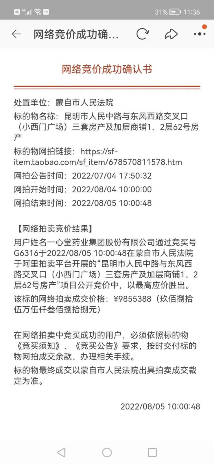 拍卖公告显示:8月5日上午,一心堂药业集团股份有限公司报名参与小西门店竞拍,同时也是少有报名参与竞买的竞买人。拍卖的最后5分钟,一心堂药业集团股份有限公司以起拍价9855388元买走小西门店。
