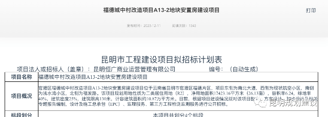 12月11日,云南省公共资源交易信息网发布《福德城中村改造项目A13-2地块安置房建设项目》招标计划。