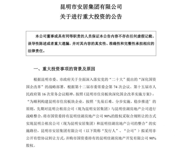 5月26日,昆明安居集团有限公司发布一则“关于进行重大投资的公告”。昆明安居集团有限公司拟采用非公开有偿协议转让方式,并购市国资委持有的昆明佳湖房地产开发有限公司90%股权。