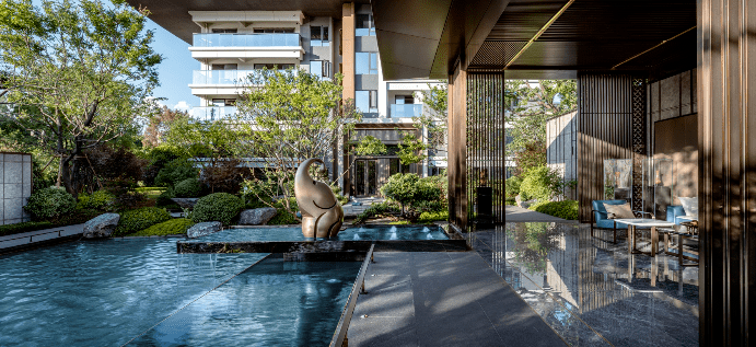 在销售阶段打开实体示范区是龙湖的升维操作,龙湖揽境汲取安缦设计灵感,极尽龙湖景观造诣手法,匠造精致度假艺术园林。