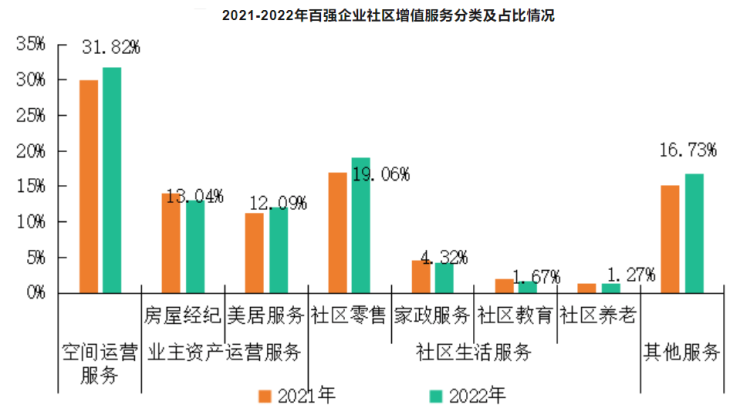 不过,增值服务中业主增值服务前景依旧广阔,2022年百强企业的业主增值服务均值约1.65亿元,同比增长6.57%。业主增值服务一般包括空间运营服务,业主资产运营服务(房屋经纪、美居服务等),社区生活服务(社区零售、家政服务、社区教育、社区养老等)以及其他服务。