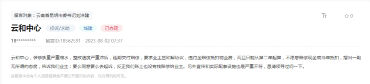 比如云和中心,项目位于双塔片区,合同约定交房时间为2022年12月30日,前期施工进展缓慢导致项目不能按时交付。通知业主交房时间延期至2023年6月30日。前期就因为工程质量问题闹得沸沸扬扬,交付之后质量堪忧。