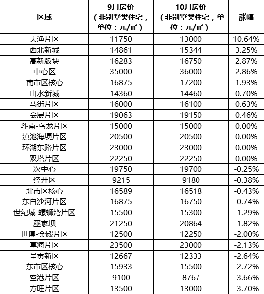 由表中数据可见,仅4个区域的房价与9月持平,8个区域房价上涨,12个区域房价下跌,不过整体跌幅不大,跌幅在0.25%-3.7%之间。