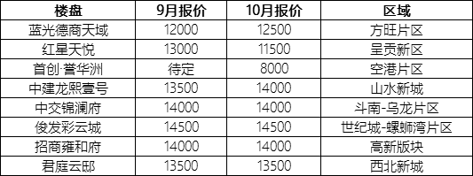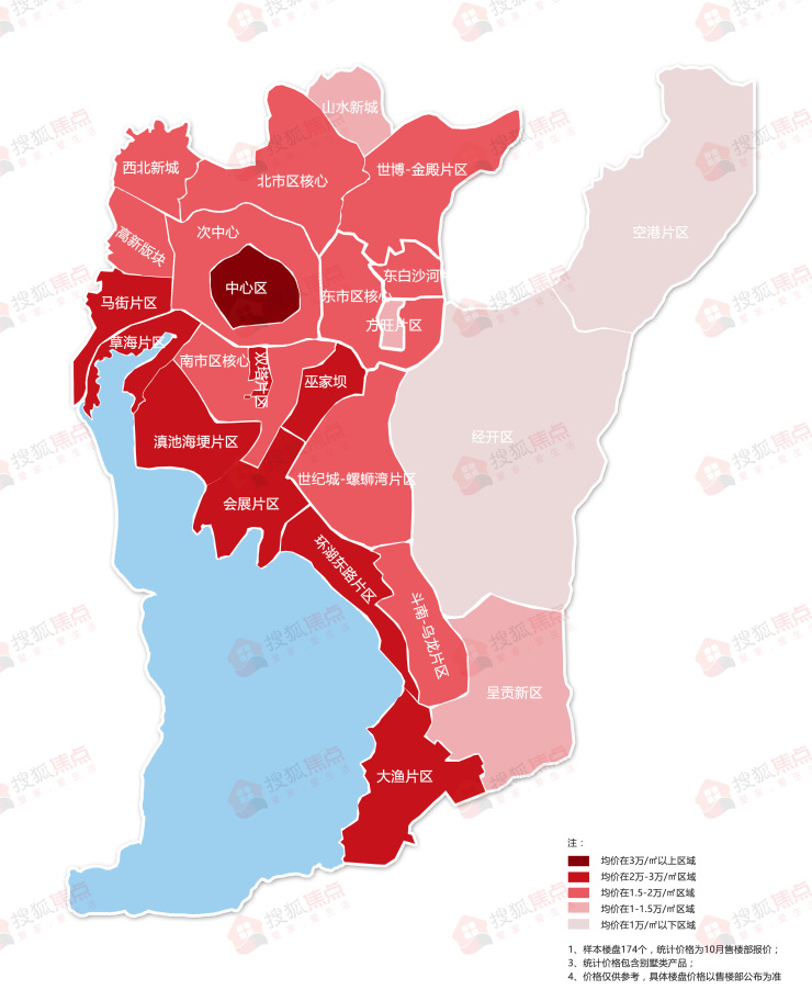 (注:区域价格由区域内楼盘价格综合计算得出,样本楼盘共174个,统计价格为售楼部10月报价,仅统计住宅产品,不含公寓价格,仅供参考。)