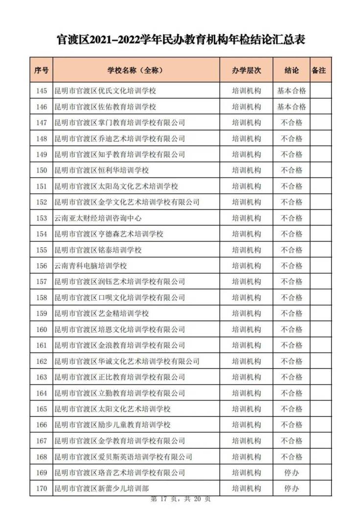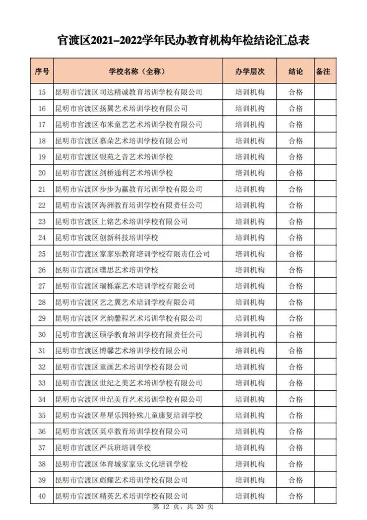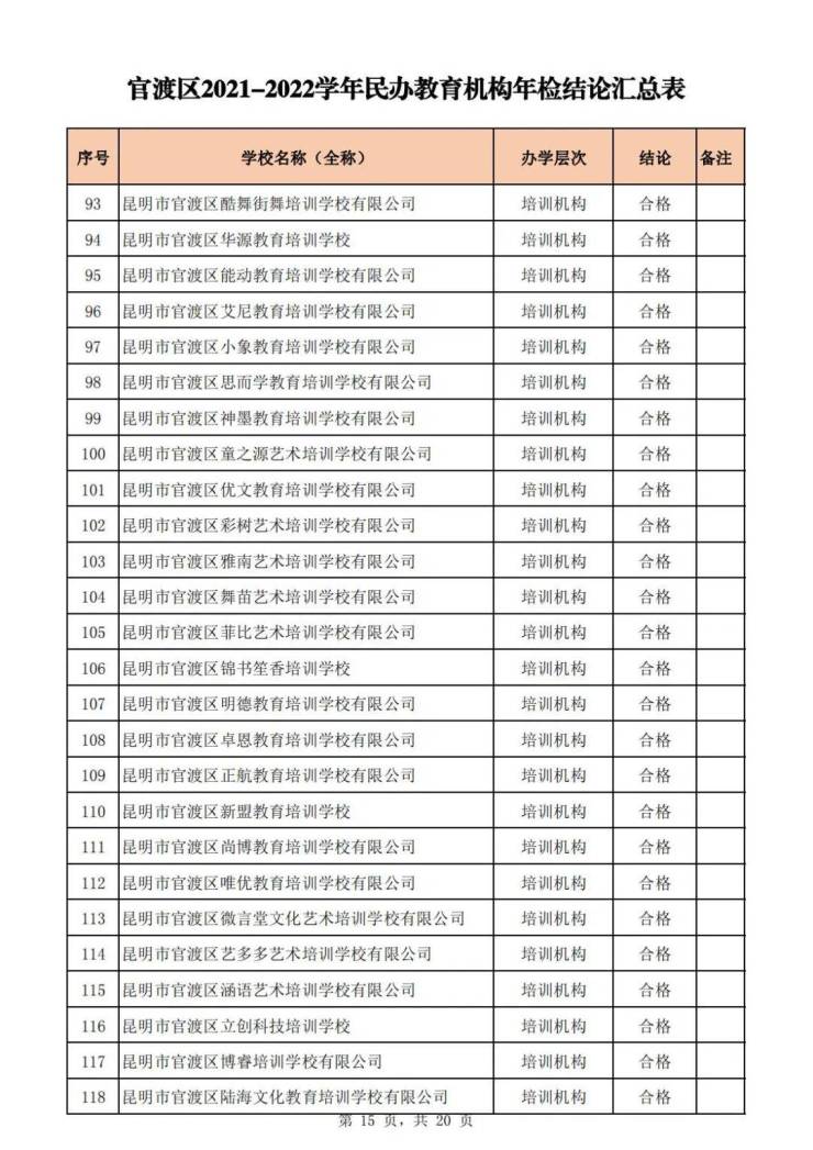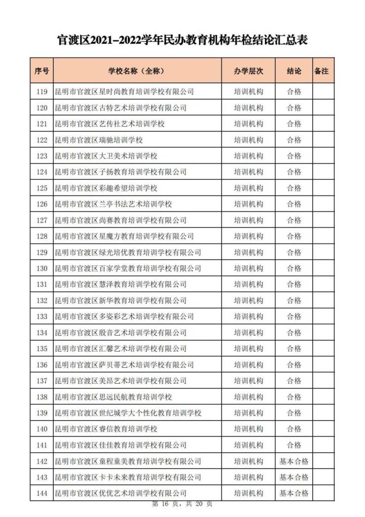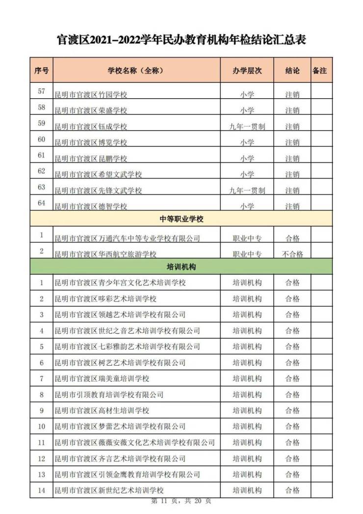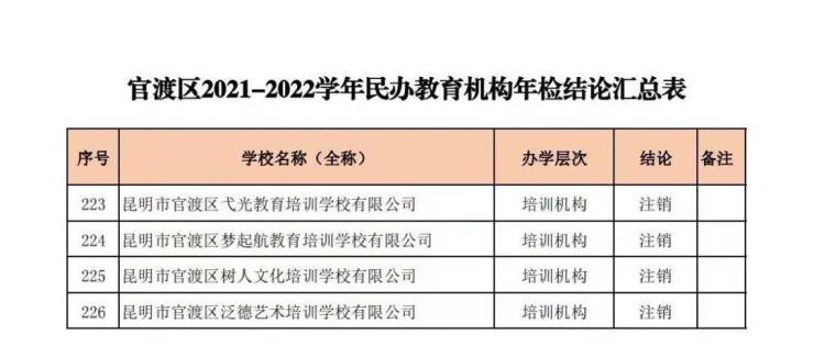 1月20日,官渡区教育体育局发布《2021—2022学年民办教育机构年检结果公示》。