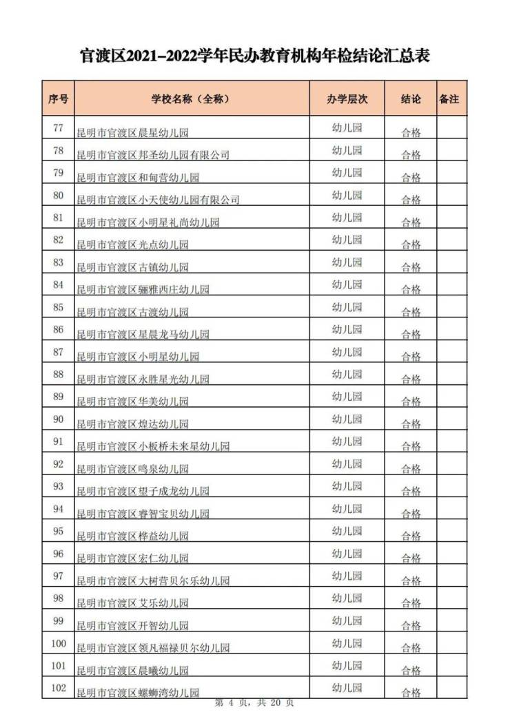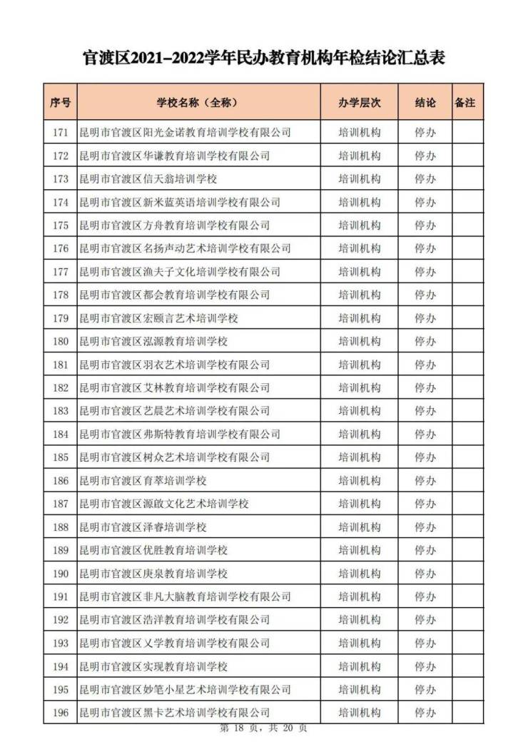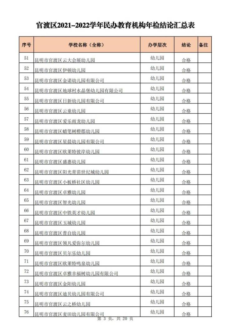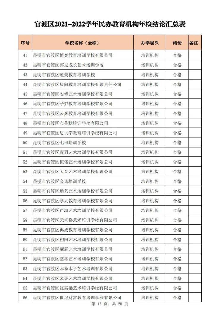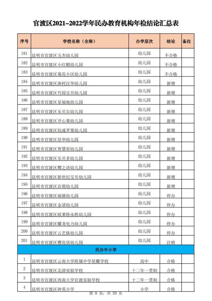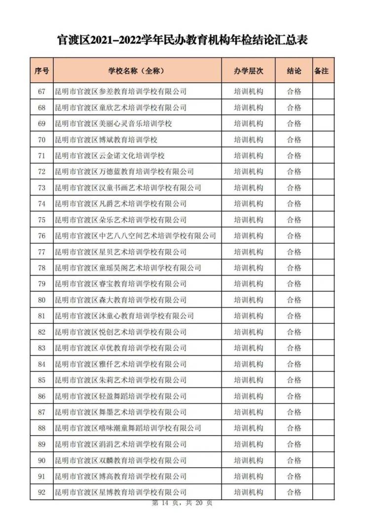 1月20日,官渡区教育体育局发布《2021—2022学年民办教育机构年检结果公示》。