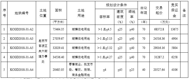 本次出让5宗地块, KCGD2018-31-A2、A3、A5、A6号地块为城镇住宅用地,面积合计约253.63亩,容积率4.27~5.32,起始楼面价约1703~2122元/㎡;KCGD2018-31-A4号地块性质为零售商业、批发市场、餐饮、旅馆、商务金融用地,面积约30.73亩,容积率≤4,起始楼面价约2505元/㎡。