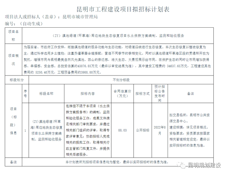 近日,昆明市城市管理局发布“滇池绿道(环草海)周边地块生态修复项目建设单位管理服务、设计服务、全过程造价咨询服务”“滇池绿道(环草海)周边地块生态修复项目水土保持方案编制服务”“滇池绿道(环草海)周边地块生态修复项目可行性研究报告编制服务”“滇池绿道(环草海)周边地块生态修复项目水土保持方案编制、监测和验收服务”等招标计划信息,计划投资43876.85万元,对绿道沿线进行生态修复。