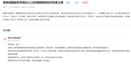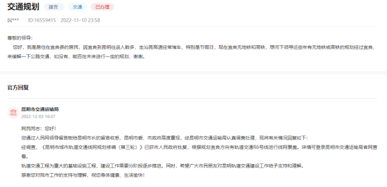 昆明市交通运输局回复:《昆明市城市轨道交通线网规划修编(第三轮)》已获市人民政府批复,依据规划方案龙泉路附近规划有8号线和10号线,服务范围已基本覆盖反映所述片区,详情可登陆昆明市交通运输局官网查看。