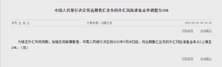9月26日,《中国银行保险报》从人民银行获悉,为稳定外汇市场预期,加强宏观审慎管理,人民银行拟将远期售汇业务的外汇风险准备金率从0上调至20%。这一调整从9月28日起生效。