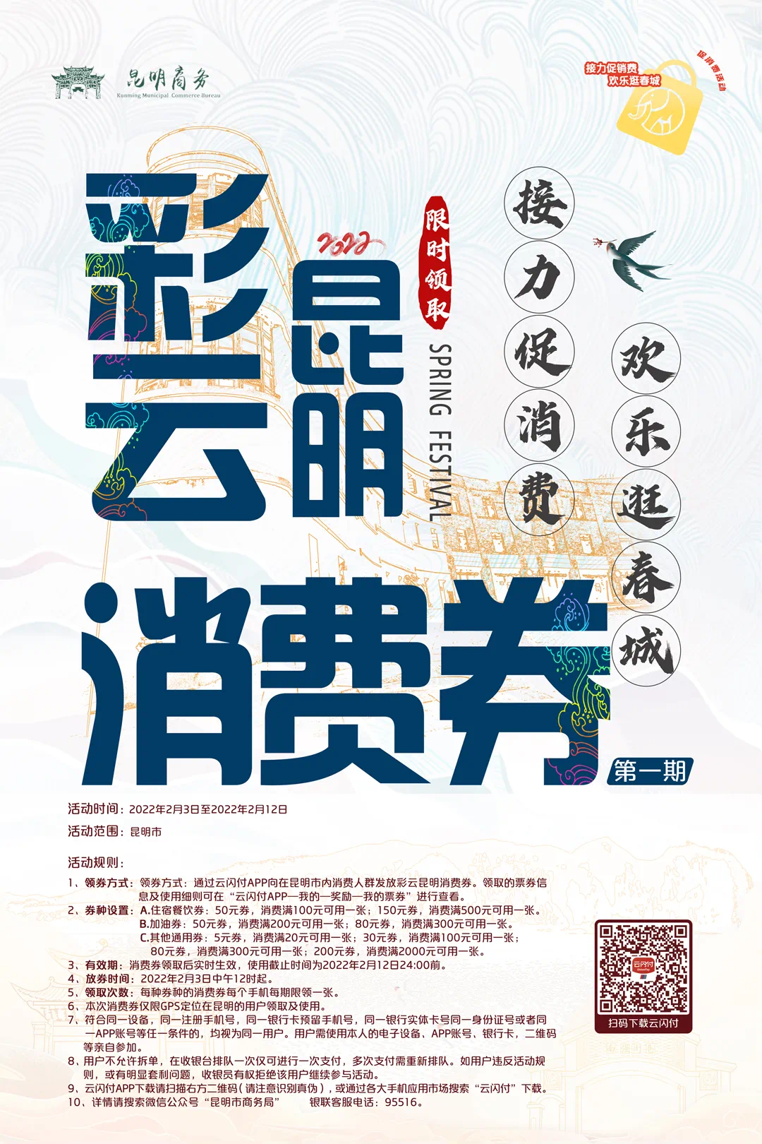 使用范围为:节假日期间重点保供零售企业及住宿、餐饮等单位,具体名单由市级相关部门核准后公布。投放平台为中国银联股份有限公司云南分公司(云闪付APP),消费者可通过云闪付APP领取,发券期内3个大类的消费券单用户各限领一张。