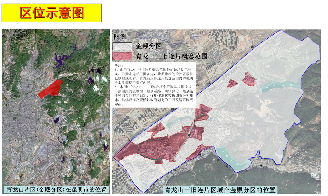 青龙山三旧连片区域位于昆明市盘龙区的东北部,金殿世博以西,昆曲以东,铂金大道以北的区域,其在现行控规中属于金殿管控单元。
