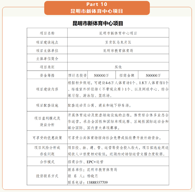 下步,昆明市将积极推进昆明市新体育中心、盘龙区银杏体育公园等4个大型体育设施,总占地面积约37万平方米,总投资约20亿元,目前正在开展前期工作。