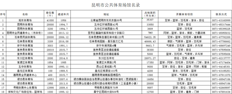 根据云南省体育局的说法,目前,昆明市有拓东体育场、市体育场、市体育馆等大型公共体育场馆18个。