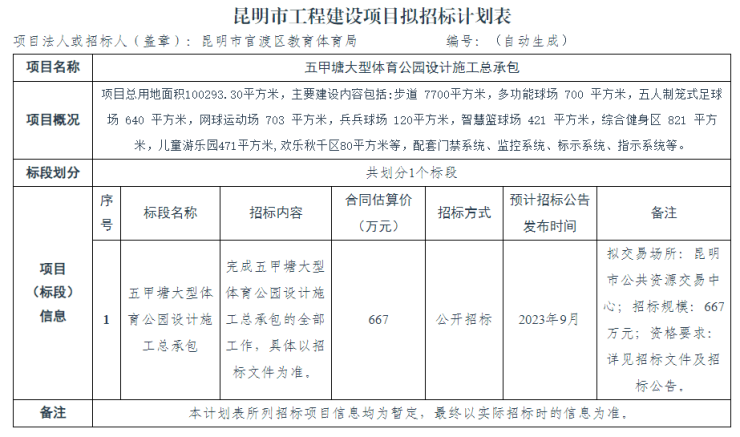 今年8月,昆明市官渡区教育体育局就发布了《五甲塘大型体育公园设计施工总承包》招标计划,其中提到,项目总用地面积100293.3㎡,主要建设内容包括:步道、多功能球场 、五人制笼式足球场、网球运动场、乒乓球场、智慧篮球场、综合健身区、儿童游乐园、欢乐秋千区等。