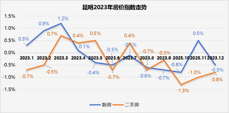 根据国家统计局发布的最新房价指数,2023年12月,昆明新房价格环比下跌0.5%、同比下跌0.6%,二手房价格环比下跌0.8%、同比下跌4%。