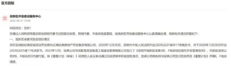 “经典双城项目开发商为云南经典房地产开发集团有限公司,2020年12月30日,昆明市中级人民法院作出(2020)云01破申17号裁定书,并于2020年12月30日作出(2020)云01破11号决定书。