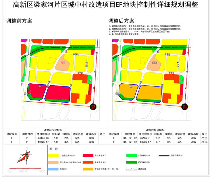 按照最早的规划,这两个地块为纯商业用地,2018年5月,两个地块调规,由商业用地改为商住混合用地,其中E地块的商住比为11.70%:88.30%,F地块的商住比为64.99%:35.01%,大型商业集中在F地块。